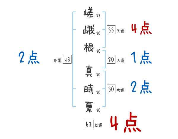 総運![]() | 嵯峨根真時夏さんの総運は63画の4つ星!家庭運がよく順調な生活。温和な性格。 あなたの人生を表す1番重要な運勢です。生涯を通じて影響する総合運となり、主に50歳以降の晩年期に影響を及ぼします。 |