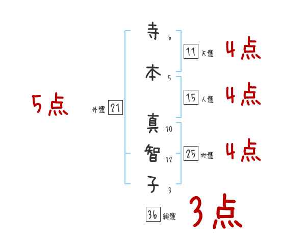 外運![]() | 寺本真智子さんの外運は21画の5つ星!統率力がある。独立し成功する。名誉を手に入れる。 生活面を象徴する運勢です。外部から受ける影響力を表し、結婚運、家庭運や職場、環境への順応性を表します。 |