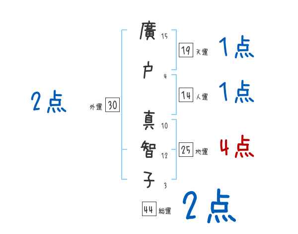総運![]() | 廣戸真智子さんの総運は44画の2つ星!誠実で慎重な性格。物事を考えすぎないように注意しましょう。 あなたの人生を表す1番重要な運勢です。生涯を通じて影響する総合運となり、主に50歳以降の晩年期に影響を及ぼします。 |