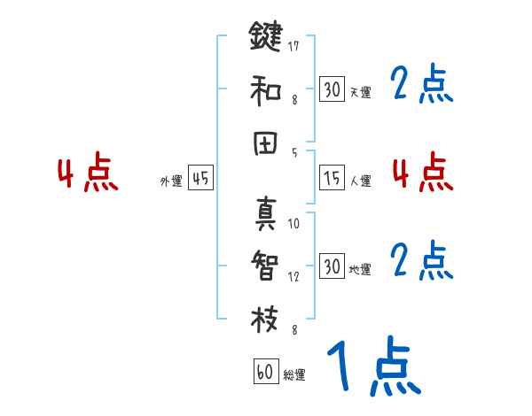 天運![]() | 鍵和田真智枝さんの天運は30画の2つ星!浮き沈みの激しさに注意しましょう。 家系が持つ宿命的な運勢を表します。祖先から受け継いだ苗字ですので自分の力が及びません。家柄を象徴します。 |