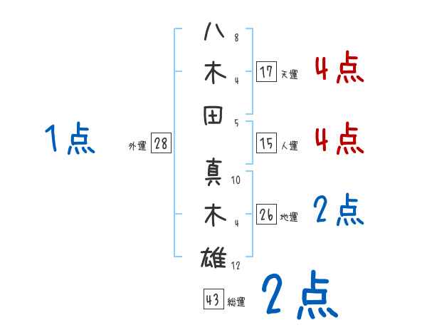 外運![]() | 八木田真木雄さんの外運は28画の1つ星!家庭環境に注意。スポーツで活躍できる能力があるかも。 生活面を象徴する運勢です。外部から受ける影響力を表し、結婚運、家庭運や職場、環境への順応性を表します。 |