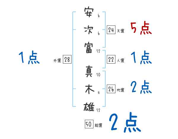 天運![]() | 安次富真木雄さんの天運は24画の5つ星!家庭運が良く順調な人生。金運にも恵まれる。 家系が持つ宿命的な運勢を表します。祖先から受け継いだ苗字ですので自分の力が及びません。家柄を象徴します。 |