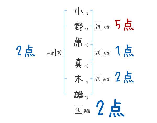 天運![]() | 小野原真木雄さんの天運は24画の5つ星!家庭運が良く順調な人生。金運にも恵まれる。 家系が持つ宿命的な運勢を表します。祖先から受け継いだ苗字ですので自分の力が及びません。家柄を象徴します。 |