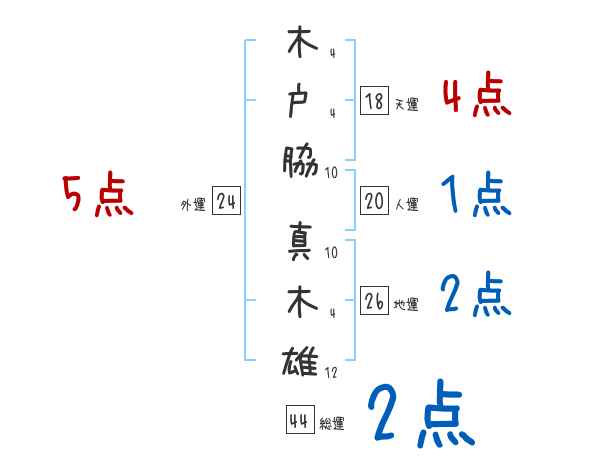 外運![]() | 木戸脇真木雄さんの外運は24画の5つ星!家庭運が良く順調な人生。金運にも恵まれる。 生活面を象徴する運勢です。外部から受ける影響力を表し、結婚運、家庭運や職場、環境への順応性を表します。 |