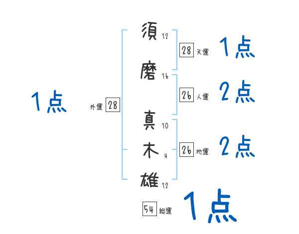 天運![]() | 須磨真木雄さんの天運は28画の1つ星!家庭環境に注意。スポーツで活躍できる能力があるかも。 家系が持つ宿命的な運勢を表します。祖先から受け継いだ苗字ですので自分の力が及びません。家柄を象徴します。 |