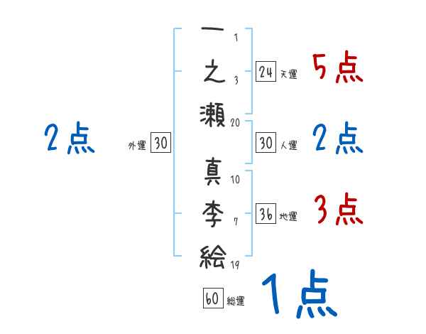 天運![]() | 一之瀬真李絵さんの天運は24画の5つ星!家庭運が良く順調な人生。金運にも恵まれる。 家系が持つ宿命的な運勢を表します。祖先から受け継いだ苗字ですので自分の力が及びません。家柄を象徴します。 |