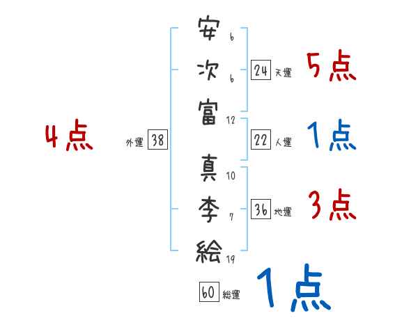 天運![]() | 安次富真李絵さんの天運は24画の5つ星!家庭運が良く順調な人生。金運にも恵まれる。 家系が持つ宿命的な運勢を表します。祖先から受け継いだ苗字ですので自分の力が及びません。家柄を象徴します。 |