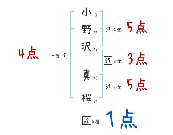 外運![]() | 小野沢真桜さんの外運は35画の4つ星!温厚な性格で感受性が高い。穏和な性格で人望が厚い。 生活面を象徴する運勢です。外部から受ける影響力を表し、結婚運、家庭運や職場、環境への順応性を表します。 |