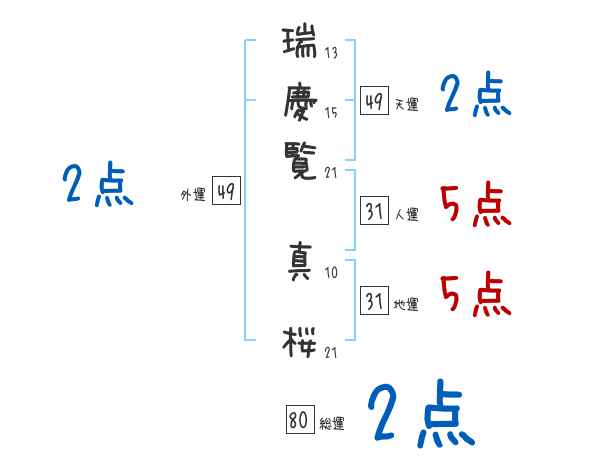 天運![]() | 瑞慶覧真桜さんの天運は49画の2つ星!不安定な性格で明暗がある人生。周りの人には支援されやすい。 家系が持つ宿命的な運勢を表します。祖先から受け継いだ苗字ですので自分の力が及びません。家柄を象徴します。 |