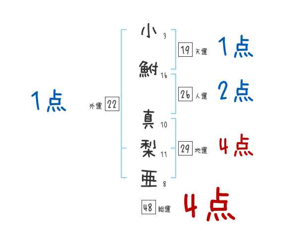 外運![]() | 小鮒真梨亜さんの外運は22画の1つ星!努力することが苦手ないっぽう手先が器用。芸術性にも優れる。 生活面を象徴する運勢です。外部から受ける影響力を表し、結婚運、家庭運や職場、環境への順応性を表します。 |