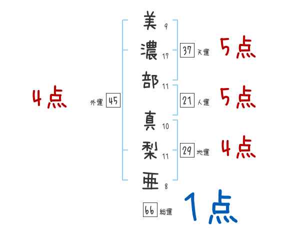 総運![]() | 美濃部真梨亜さんの総運は66画の1つ星!迷うことが多く挫折しやすい傾向が。辛抱強く物事に取り組みましょう。 あなたの人生を表す1番重要な運勢です。生涯を通じて影響する総合運となり、主に50歳以降の晩年期に影響を及ぼします。 |