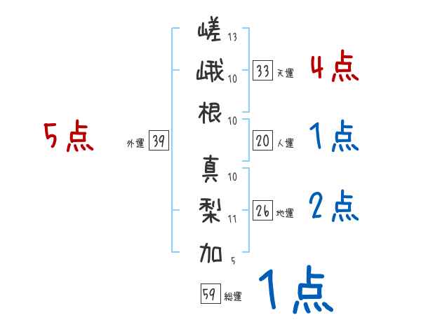 外運![]() | 嵯峨根真梨加さんの外運は39画の5つ星!社交性に優れ人望が厚い。人の上に立ち成功する。 生活面を象徴する運勢です。外部から受ける影響力を表し、結婚運、家庭運や職場、環境への順応性を表します。 |