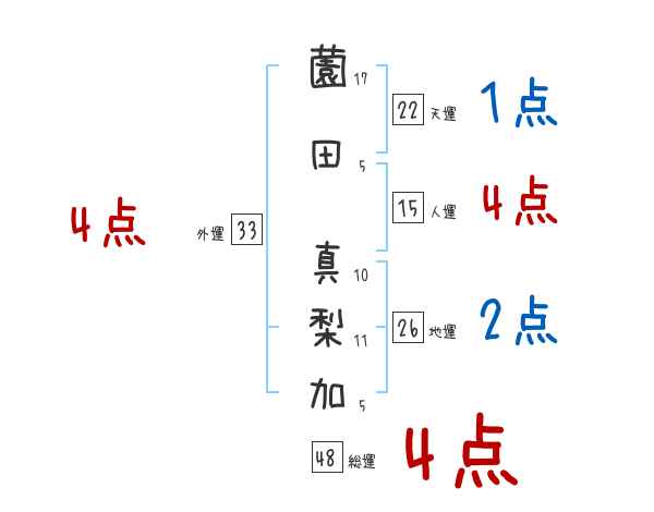 外運![]() | 薗田真梨加さんの外運は33画の4つ星!権力志向でプライドが高い。勇気があり運を切り開き成功する。 生活面を象徴する運勢です。外部から受ける影響力を表し、結婚運、家庭運や職場、環境への順応性を表します。 |