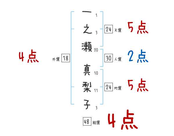 外運![]() | 一之瀬真梨子さんの外運は18画の4つ星!情熱的で剛気。忍耐力があり信頼される。 生活面を象徴する運勢です。外部から受ける影響力を表し、結婚運、家庭運や職場、環境への順応性を表します。 |
