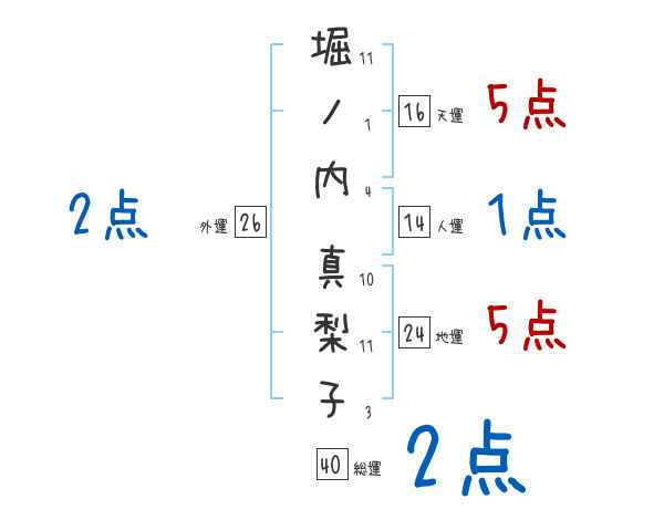 外運![]() | 堀ノ内真梨子さんの外運は26画の2つ星!波瀾万丈かも。信頼できる人を大事にしましょう。 生活面を象徴する運勢です。外部から受ける影響力を表し、結婚運、家庭運や職場、環境への順応性を表します。 |