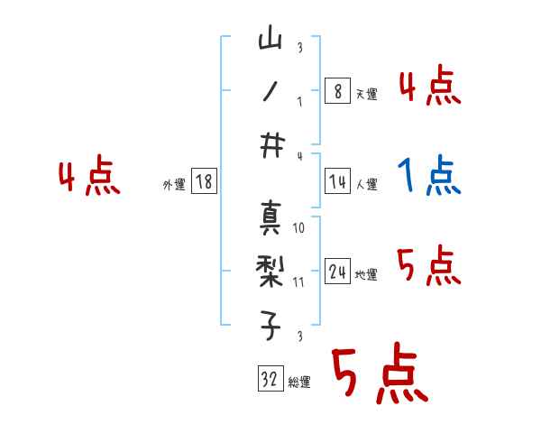 総運![]() | 山ノ井真梨子さんの総運は32画の5つ星!柔軟性があり成功する。チャンスが多く金運が良い。 あなたの人生を表す1番重要な運勢です。生涯を通じて影響する総合運となり、主に50歳以降の晩年期に影響を及ぼします。 |