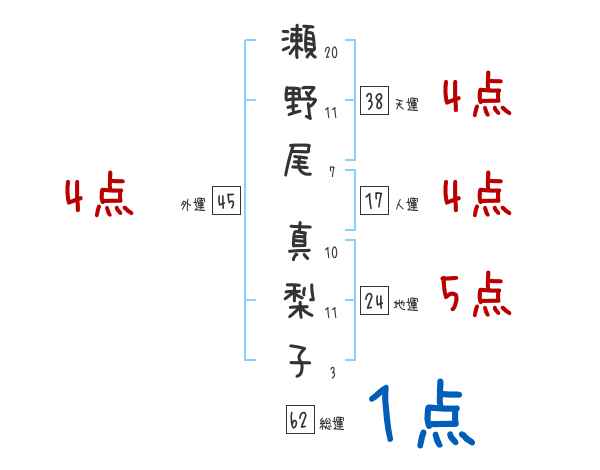 外運![]() | 瀬野尾真梨子さんの外運は45画の4つ星!もくもくと物事を進め達成する。地味な努力家。 生活面を象徴する運勢です。外部から受ける影響力を表し、結婚運、家庭運や職場、環境への順応性を表します。 |