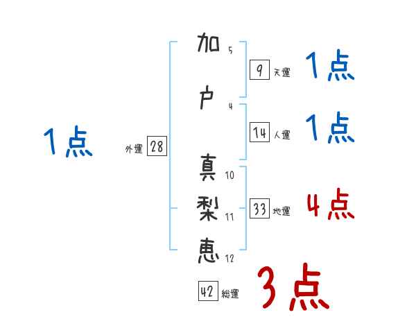 天運![]() | 加戸真梨恵さんの天運は9画の1つ星!消極的で才能を発揮することが苦手なことも。周りの意見に耳を傾けましょう。 家系が持つ宿命的な運勢を表します。祖先から受け継いだ苗字ですので自分の力が及びません。家柄を象徴します。 |