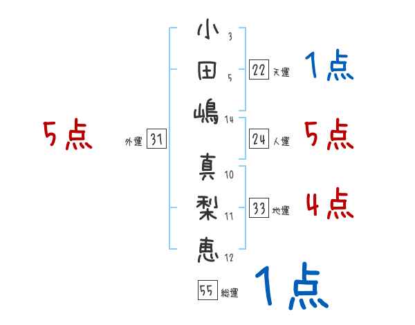 天運![]() | 小田嶋真梨恵さんの天運は22画の1つ星!努力することが苦手ないっぽう手先が器用。芸術性にも優れる。 家系が持つ宿命的な運勢を表します。祖先から受け継いだ苗字ですので自分の力が及びません。家柄を象徴します。 |