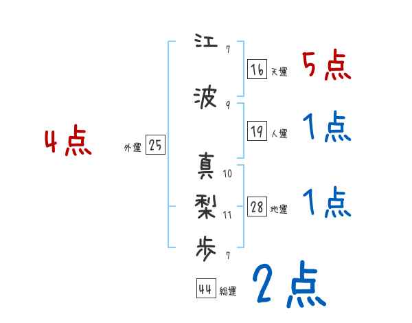 天運![]() | 江波真梨歩さんの天運は16画の5つ星!人望が厚く大きく発展する。逆転成功が見える。 家系が持つ宿命的な運勢を表します。祖先から受け継いだ苗字ですので自分の力が及びません。家柄を象徴します。 |