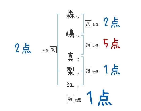総運![]() | 森嶋真梨江さんの総運は54画の1つ星!トラブルが多いかも。周りをよく見て協調して過ごしましょう。 あなたの人生を表す1番重要な運勢です。生涯を通じて影響する総合運となり、主に50歳以降の晩年期に影響を及ぼします。 |