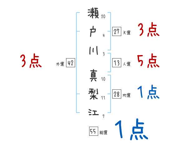 天運![]() | 瀬戸川真梨江さんの天運は27画の3つ星!頭脳明晰だが強情で摩擦が多い傾向。孤立に注意。 家系が持つ宿命的な運勢を表します。祖先から受け継いだ苗字ですので自分の力が及びません。家柄を象徴します。 |