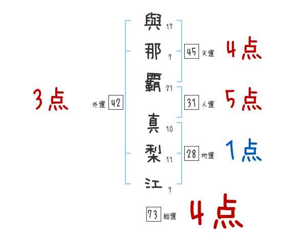 外運![]() | 與那覇真梨江さんの外運は42画の3つ星!病気に注意。多芸であるが消極的でおとなしい。 生活面を象徴する運勢です。外部から受ける影響力を表し、結婚運、家庭運や職場、環境への順応性を表します。 |