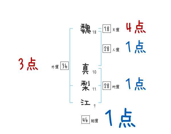 天運![]() | 魏真梨江さんの天運は18画の4つ星!情熱的で剛気。忍耐力があり信頼される。 家系が持つ宿命的な運勢を表します。祖先から受け継いだ苗字ですので自分の力が及びません。家柄を象徴します。 |