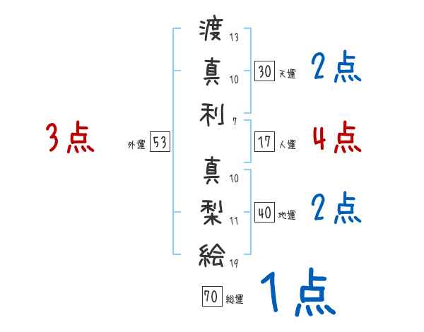外運![]() | 渡真利真梨絵さんの外運は53画の3つ星!やや見栄っ張りで虚栄心がある。散財に注意。 生活面を象徴する運勢です。外部から受ける影響力を表し、結婚運、家庭運や職場、環境への順応性を表します。 |