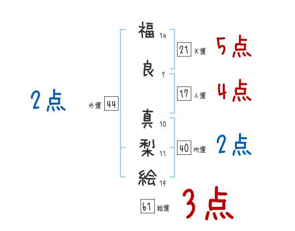 外運![]() | 福良真梨絵さんの外運は44画の2つ星!誠実で慎重な性格。物事を考えすぎないように注意しましょう。 生活面を象徴する運勢です。外部から受ける影響力を表し、結婚運、家庭運や職場、環境への順応性を表します。 |