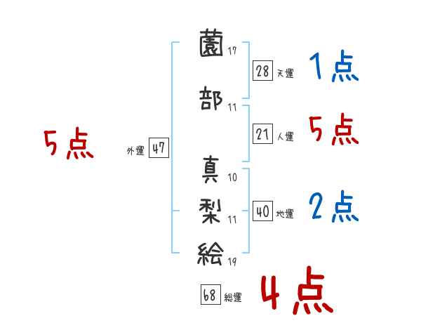 外運![]() | 薗部真梨絵さんの外運は47画の5つ星!実力が開花し発展する円満な人生。財に恵まれる。 生活面を象徴する運勢です。外部から受ける影響力を表し、結婚運、家庭運や職場、環境への順応性を表します。 |