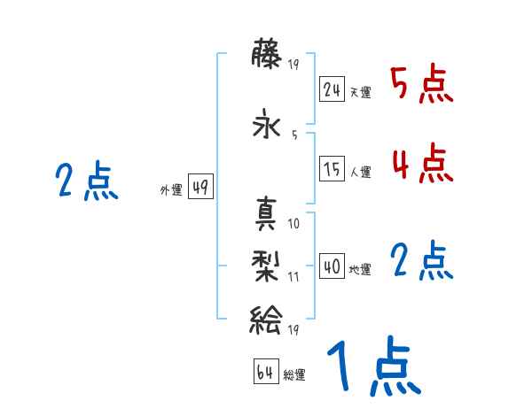 天運![]() | 藤永真梨絵さんの天運は24画の5つ星!家庭運が良く順調な人生。金運にも恵まれる。 家系が持つ宿命的な運勢を表します。祖先から受け継いだ苗字ですので自分の力が及びません。家柄を象徴します。 |