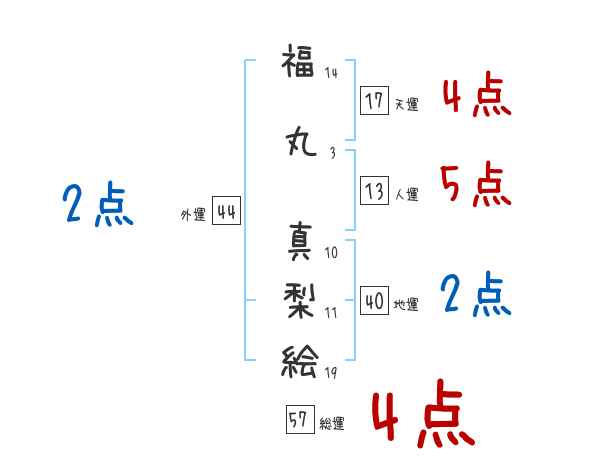 外運![]() | 福丸真梨絵さんの外運は44画の2つ星!誠実で慎重な性格。物事を考えすぎないように注意しましょう。 生活面を象徴する運勢です。外部から受ける影響力を表し、結婚運、家庭運や職場、環境への順応性を表します。 |