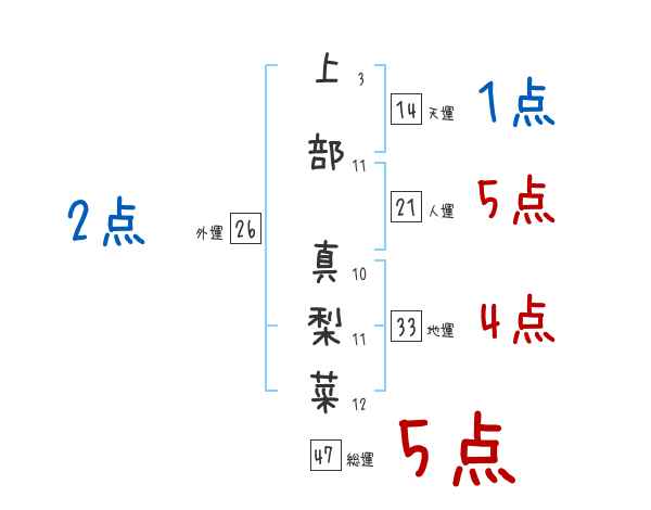 総運![]() | 上部真梨菜さんの総運は47画の5つ星!実力が開花し発展する円満な人生。財に恵まれる。 あなたの人生を表す1番重要な運勢です。生涯を通じて影響する総合運となり、主に50歳以降の晩年期に影響を及ぼします。 |