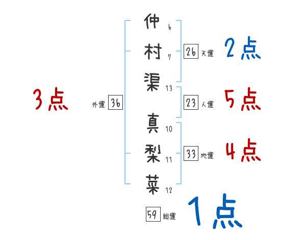 外運![]() | 仲村渠真梨菜さんの外運は36画の3つ星!先見性が豊かです。多少神経質で苦労することも。 生活面を象徴する運勢です。外部から受ける影響力を表し、結婚運、家庭運や職場、環境への順応性を表します。 |