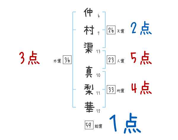 天運![]() | 仲村渠真梨華さんの天運は26画の2つ星!波瀾万丈かも。信頼できる人を大事にしましょう。 家系が持つ宿命的な運勢を表します。祖先から受け継いだ苗字ですので自分の力が及びません。家柄を象徴します。 |
