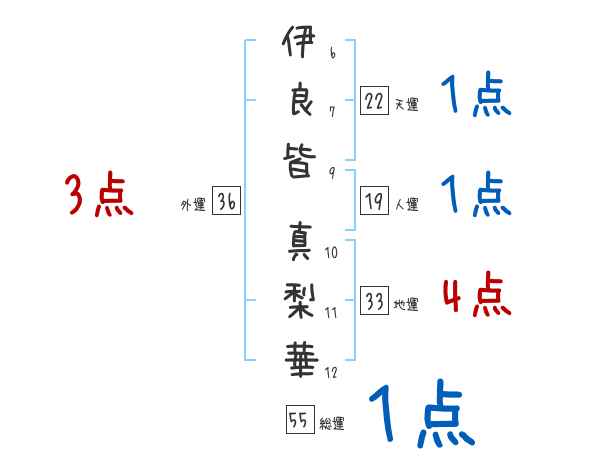 外運![]() | 伊良皆真梨華さんの外運は36画の3つ星!先見性が豊かです。多少神経質で苦労することも。 生活面を象徴する運勢です。外部から受ける影響力を表し、結婚運、家庭運や職場、環境への順応性を表します。 |