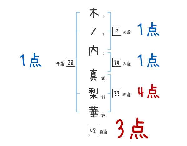 外運![]() | 木ノ内真梨華さんの外運は28画の1つ星!家庭環境に注意。スポーツで活躍できる能力があるかも。 生活面を象徴する運勢です。外部から受ける影響力を表し、結婚運、家庭運や職場、環境への順応性を表します。 |