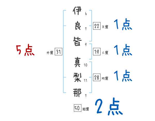外運![]() | 伊良皆真梨那さんの外運は31画の5つ星!社交性があり判断力に優れる。順風満帆な人生で円満な生活。 生活面を象徴する運勢です。外部から受ける影響力を表し、結婚運、家庭運や職場、環境への順応性を表します。 |