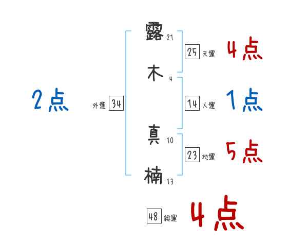 天運![]() | 露木真楠さんの天運は25画の4つ星!個性があり才能があふれる。強運の持ち主で発展する。 家系が持つ宿命的な運勢を表します。祖先から受け継いだ苗字ですので自分の力が及びません。家柄を象徴します。 |