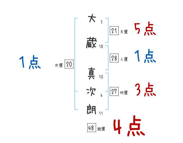 天運![]() | 大蔵真次朗さんの天運は21画の5つ星!統率力がある。独立し成功する。名誉を手に入れる。 家系が持つ宿命的な運勢を表します。祖先から受け継いだ苗字ですので自分の力が及びません。家柄を象徴します。 |