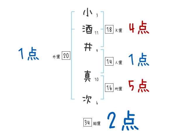 総運![]() | 小酒井真次さんの総運は34画の2つ星!独創性に優れるが、自尊心が強く災難に注意しましょう。 あなたの人生を表す1番重要な運勢です。生涯を通じて影響する総合運となり、主に50歳以降の晩年期に影響を及ぼします。 |