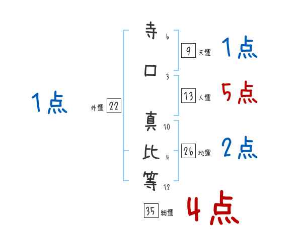 外運![]() | 寺口真比等さんの外運は22画の1つ星!努力することが苦手ないっぽう手先が器用。芸術性にも優れる。 生活面を象徴する運勢です。外部から受ける影響力を表し、結婚運、家庭運や職場、環境への順応性を表します。 |