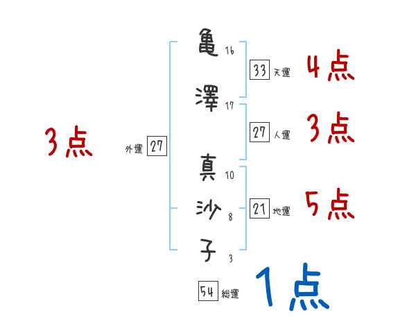 天運![]() | 亀澤真沙子さんの天運は33画の4つ星!権力志向でプライドが高い。勇気があり運を切り開き成功する。 家系が持つ宿命的な運勢を表します。祖先から受け継いだ苗字ですので自分の力が及びません。家柄を象徴します。 |