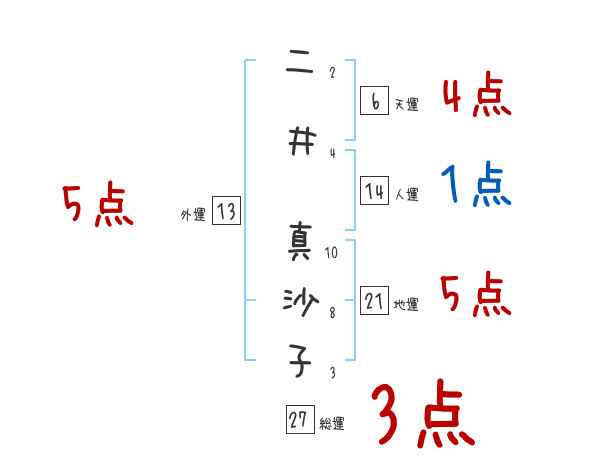 天運![]() | 二井真沙子さんの天運は6画の4つ星!慎重な努力家で信頼を得る。誠実な精神で向上心に優れる。 家系が持つ宿命的な運勢を表します。祖先から受け継いだ苗字ですので自分の力が及びません。家柄を象徴します。 |