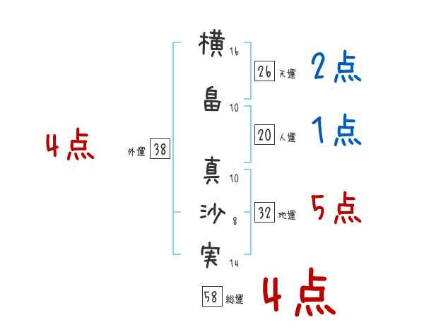 外運![]() | 横畠真沙実さんの外運は38画の4つ星!温厚な性格で技術的な才能を発揮する。職人的な仕事に向いている。 生活面を象徴する運勢です。外部から受ける影響力を表し、結婚運、家庭運や職場、環境への順応性を表します。 |