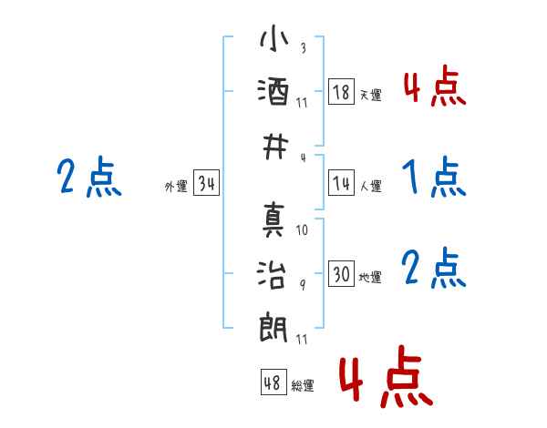 天運![]() | 小酒井真治朗さんの天運は18画の4つ星!情熱的で剛気。忍耐力があり信頼される。 家系が持つ宿命的な運勢を表します。祖先から受け継いだ苗字ですので自分の力が及びません。家柄を象徴します。 |