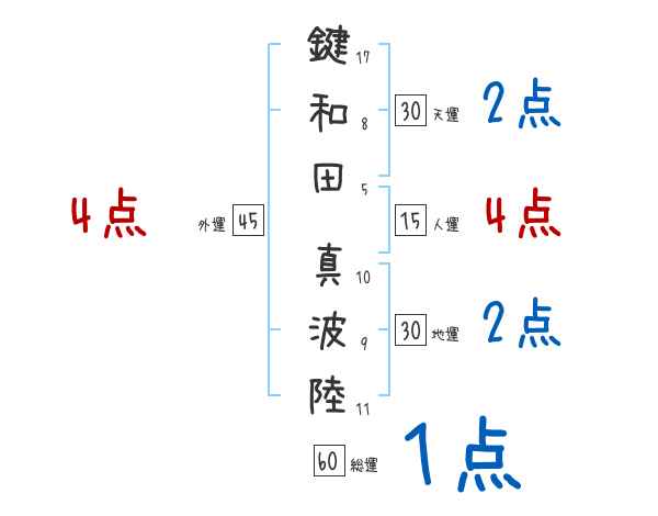 総運![]() | 鍵和田真波陸さんの総運は60画の1つ星!悲観的で迷いやすい。波乱が多く損をしないように。 あなたの人生を表す1番重要な運勢です。生涯を通じて影響する総合運となり、主に50歳以降の晩年期に影響を及ぼします。 |