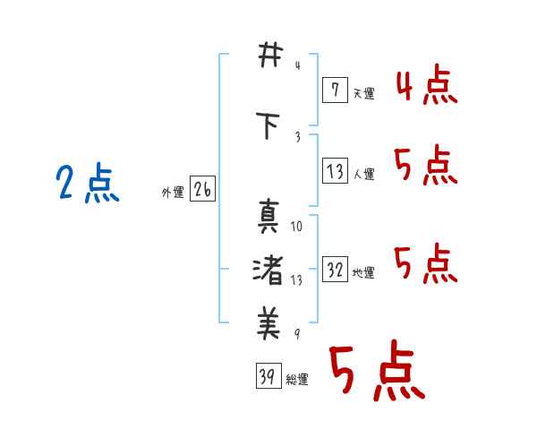 | 天運  | 井下真渚美さんの天運は7画の4つ星!強い意志や信念を持ち独立心が強い。自立する。家系が持つ宿命的な運勢を表します。祖先から受け継いだ苗字ですので自分の力が及びません。家柄を象徴します。 |