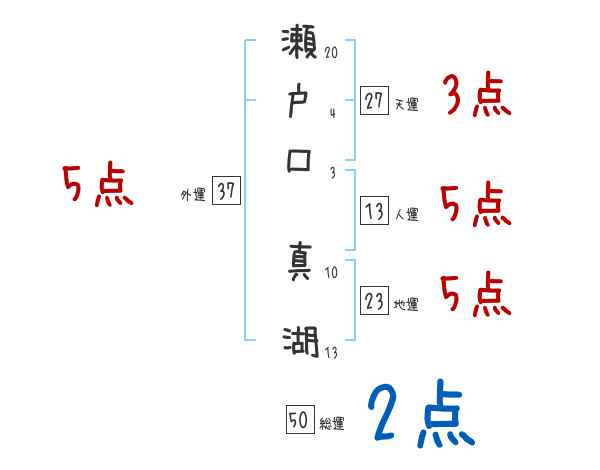 天運![]() | 瀬戸口真湖さんの天運は27画の3つ星!頭脳明晰だが強情で摩擦が多い傾向。孤立に注意。 家系が持つ宿命的な運勢を表します。祖先から受け継いだ苗字ですので自分の力が及びません。家柄を象徴します。 |